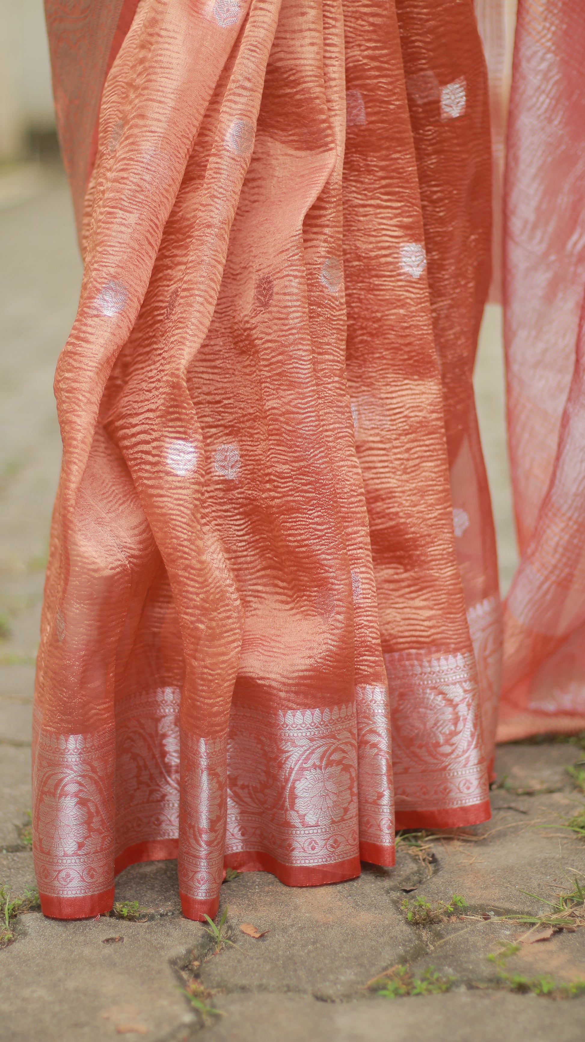 Crushed Tissue saree with silver zari buttas and border all over the saree.