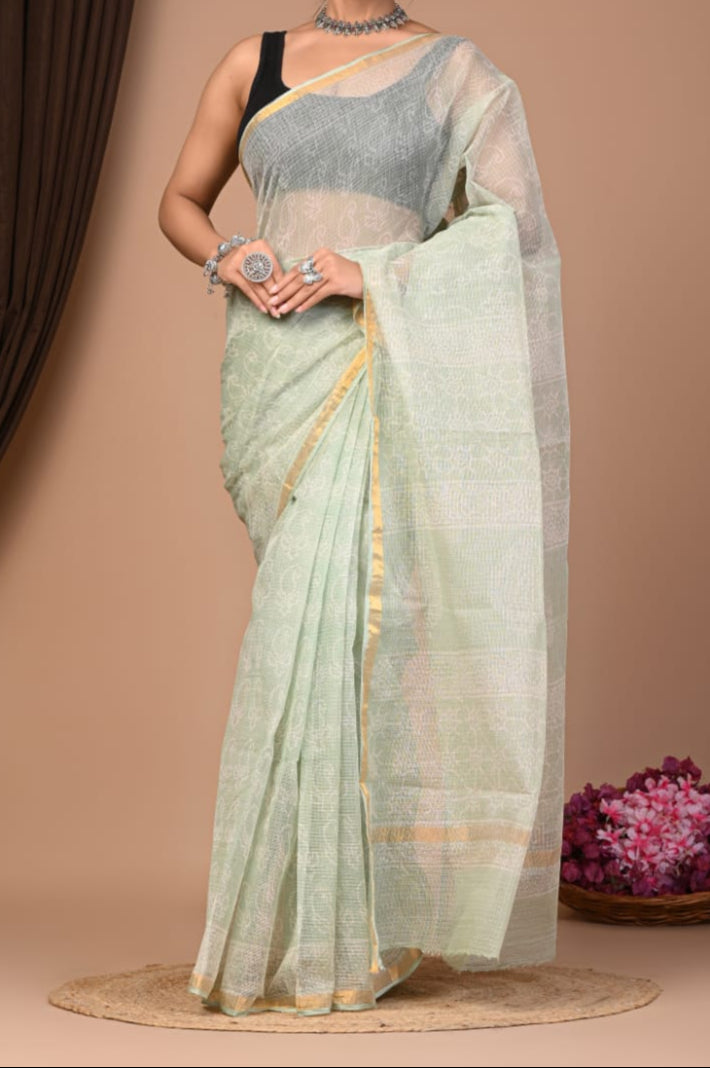 Sarees comes with hand block print using natural dye, though efforts have been made to avoid any defects,  there might be slight imperfections in the pattern and colours are common in these sarees.